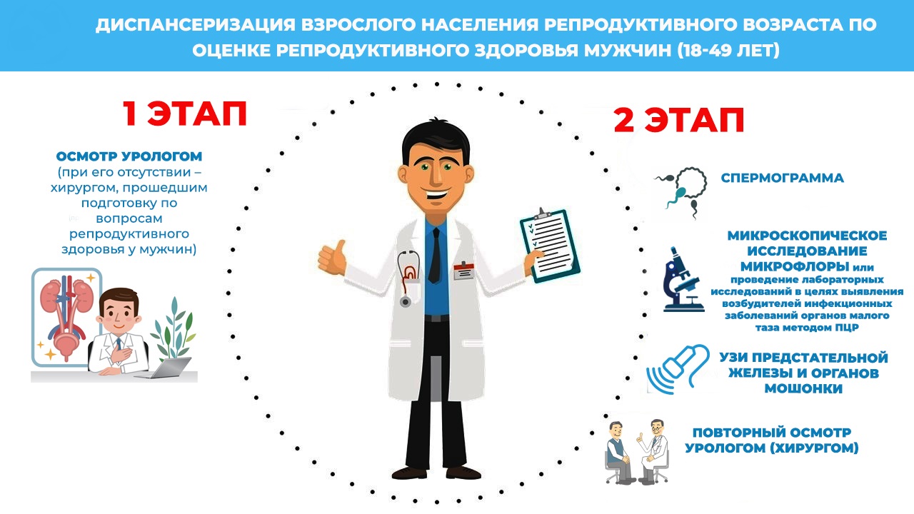 Диспансеризация репродуктивного здоровья мужчин проводится в два этапа с 2024 года. Цель — выявить признаки заболеваний или состояний, которые могут негативно повлиять на беременность, течение беременности, роды и послеродовой период, а также факторы риска их развития. Перечень исследований закреплён в Программе государственных гарантий бесплатного оказания гражданам медицинской помощи на 2024–2026 годы (Приложение №6).